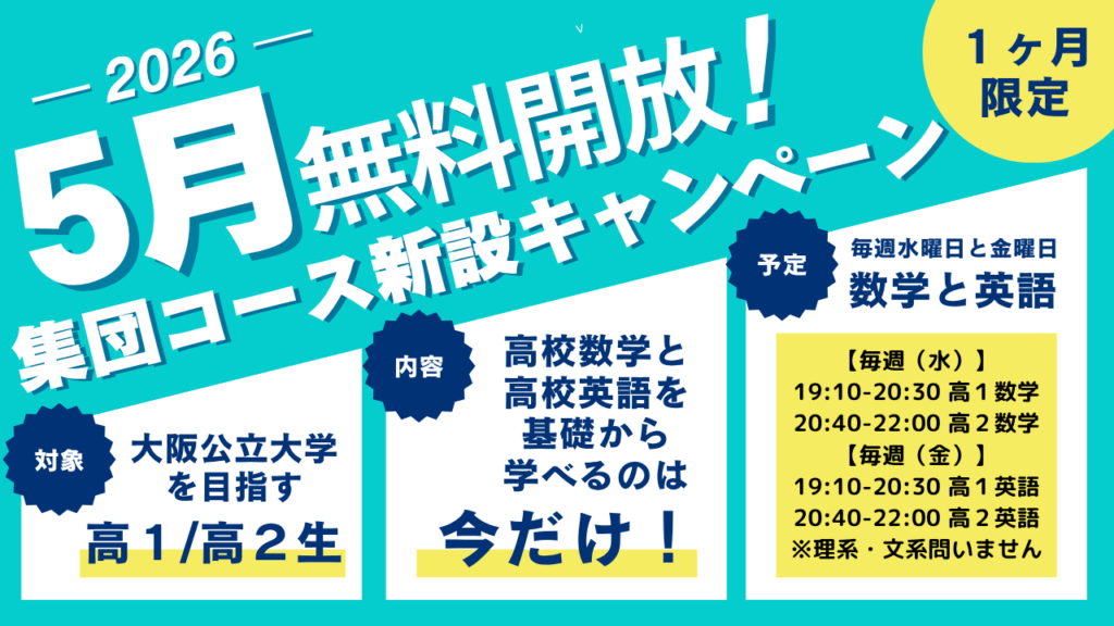 大阪公立大学志望を中心とした集団コースを新設します! 新コース設立の記念にキャンペーンを行います!すべて僕が教えます! 体験生の募集要項 対象:高校1年生・高校2年生 難易度:大阪公立大学を目安とした国公立大学の現役合格を目指す。 体験内容:... -