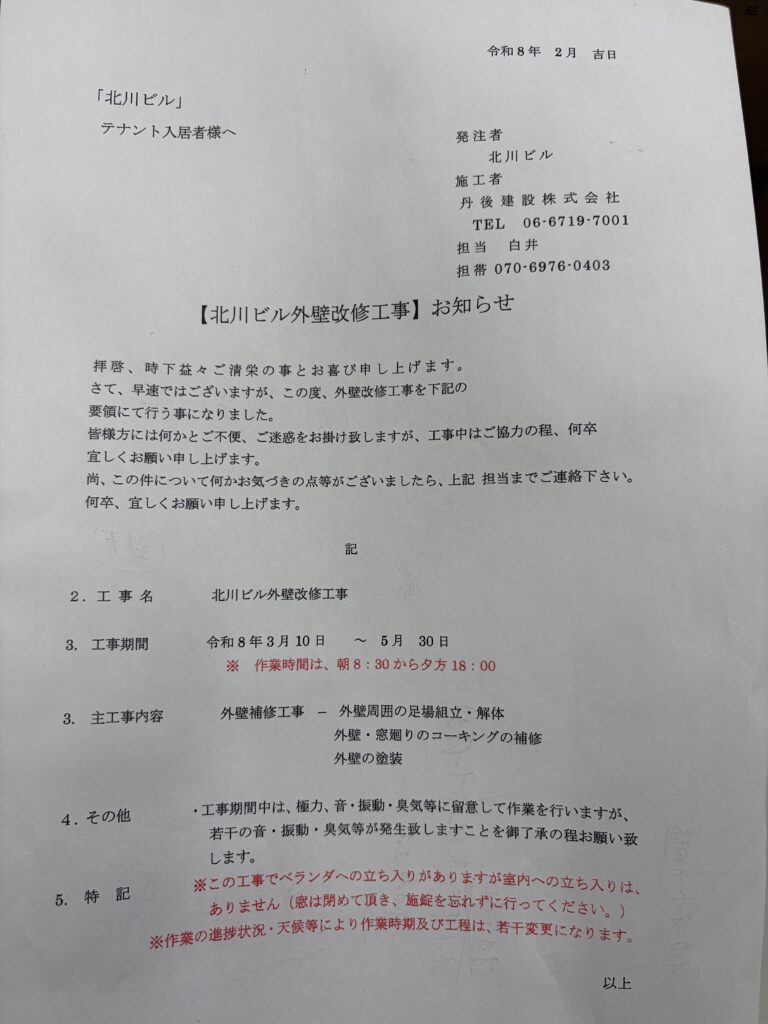 工事期間中は建物全体が足場とシートで覆われるため、環境に一時的な変化がございますが、