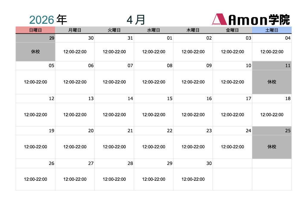 【Amon学院】2026年4月予定表 2026 3/28 お知らせ 2026年1月26日2026年3月28日 お知らせ お知らせ 共通テスト 国公立 大学受験 河内松原 生野高校 よかったらシェアしてね! URLをコピーしました! URLをコピーしました! 【完全版】高校物理の講義プリント&講義授業動画をすべて公開します【塾長7年間の集大成】 【お知らせ】北側ビル外壁工事に伴うご案内 この記事を書いた人 Amongakuin 関連記事 【1ヶ月すべて無料!】2026年5月より集団コースを新設します! 2026年4月13日 【集団コース新設のお知らせ】5月は1ヶ月間すべて無料開放します! 2026年4月13日 【お知らせ】北側ビル外壁工事に伴うご案内 2026年3月31日 【メディア掲載】「Ameba塾探し」様にてAmon学院を取材していただきました! 2025年3月19日 【体験生も利用可能】京大生によるLINE質問サービス!問題解説・進路相談などなんでも可能! 2024年10月3日 【Amon学院とは?】なぜ共通テストにこだわる?集団と個別指導どっち? 2024年2月7日 【大阪公立大編】各教科を何分ずつ勉強したら良いかがわかる!学習時間配分 2024年1月18日 コメント コメントする コメントをキャンセルコメント ※ 名前 ※ メール ※ サイト 次回のコメントで使用するためブラウザーに自分の名前、メールアドレス、サイトを保存する。